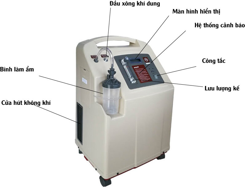 - Hệ thống đèn cảnh báo: Giúp cảnh báo khi áp suất quá cao hoặc quá thấp, chất lượng oxy đầu ra không đạt tiêu chuẩn, sự cố..