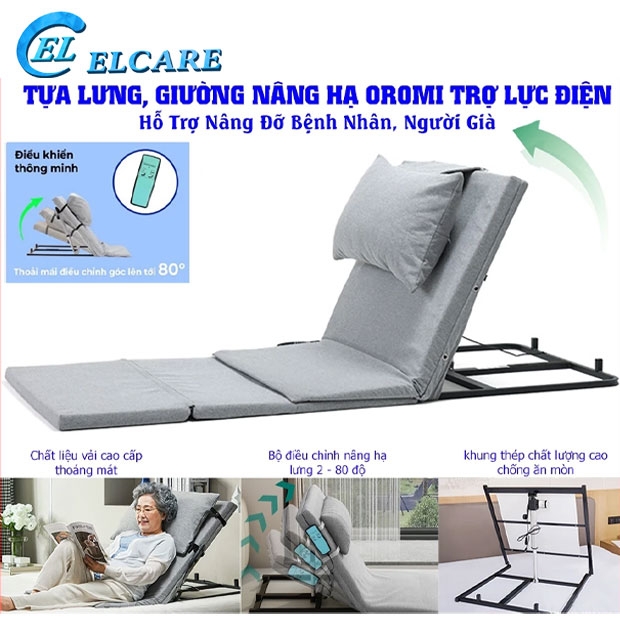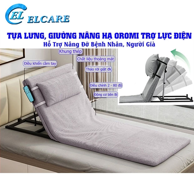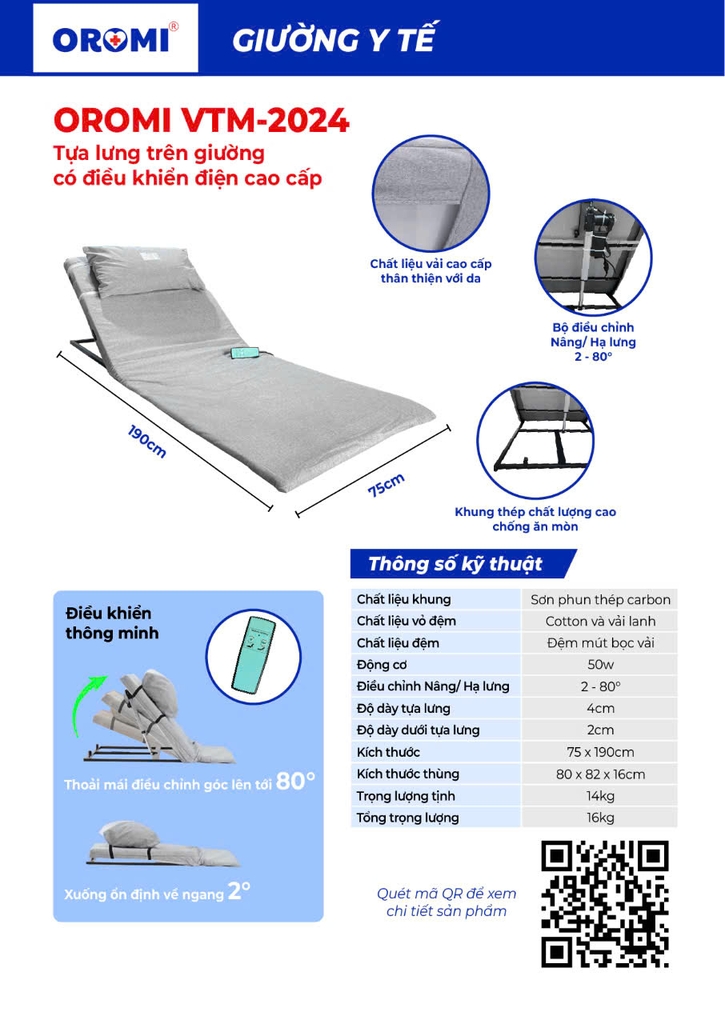 Tấm tựa lưng có điều khiển điện Oromi VTM-2024 là sản phẩm hỗ trợ đắc lực khi chăm sóc cho người già, người bệnh. Thiết bị hỗ trợ nâng đỡ người người bệnh, người già, bà bầu, người bị liệt, người bị đột quỵ, tai biến, người bị thoát vị, đau lưng, người bị bệnh viêm phổi, người mới phẫu thuật,... Thiết bị giúp người dùng thay đổi tư thế, ngồi dậy trên giường mà không mỏi. Sản phẩm cho phép thay đổi nhiều góc độ khác nhau (từ 2 – 80 độ).