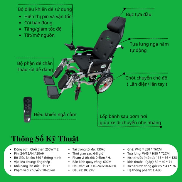 - Xe Lăn Điện Ngả Nằm Tự Động HD – W68065 – là mẫu xe lăn mang tính đột phá, thiết kế dành cho người già, người khuyết tật. Chiếc xe cao cấp thế hệ mới này không những giúp cho họ có thể di chuyển dễ dàng. Mà còn hỗ trợ phục hồi chức năng cho người bệnh trong ngành y tế. Xe có tích hợp hệ thống điều khiển tự động giúp người dùng thư giãn với hệ thống ghế tựa ngả về sau giúp giảm mệt mỏi.