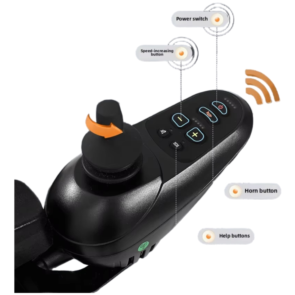 - Cần điều khiển tiện dụng với nhiều chức năng như: tiến – lùi – rẽ trái/phải, tăng/giảm tốc độ, còi và hiển thị pin. Người cao tuổi cũng có thể dễ dàng làm quen và sử dụng.