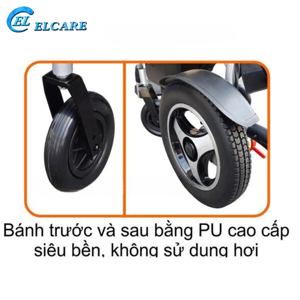 Bánh xe trước và sau XE LĂN ĐIỆN LUCASS XE-122L được làm từ PU siêu bền, bánh đặc, chúng ta không cần phải bơm hơi thương xuyên như những dòng xe lăn bánh hơi, rất thuận tiện cho người bệnh.